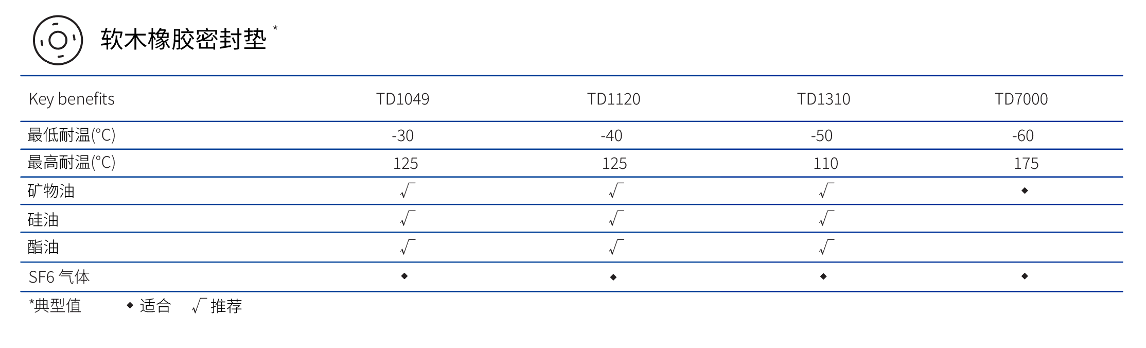AMORIM阿莫林軟木橡膠密封材料TD1120、TD1049、TD1310、TD7000因其良好的機械性能、耐變壓器油等特性廣泛應(yīng)用于變壓器行業(yè)。詳細參數(shù)如下: